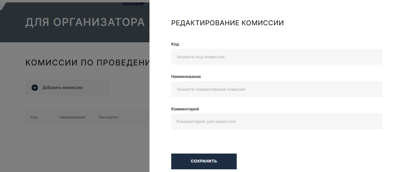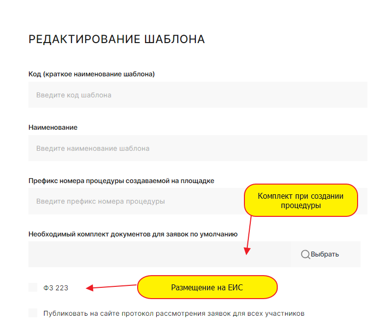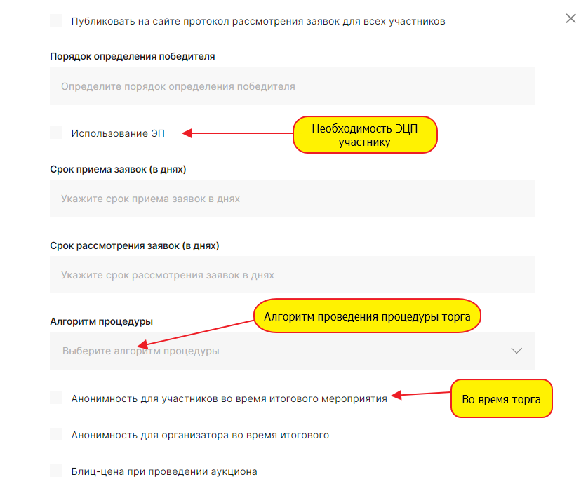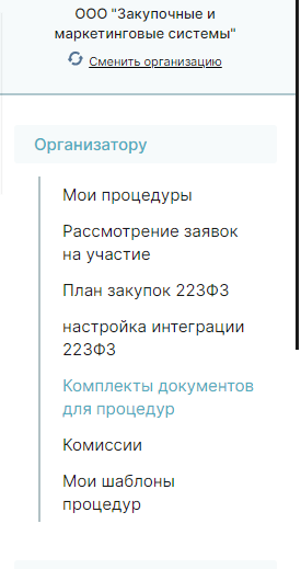 Для размещения процедуры необходимо определится с потребностью: - создания нового комплекта документов запрашиваемого у претендентов на участие в процедуре, - создания нового шаблона процедуры, - создание комиссии для принятия решения по каждому этапу процедуры закупки/продажи. 1.Комплект документов для подачи предложений участниками Для создания нового комплекта документов необходимо: Добавить новый комплект документов можно копированием существующего комплекта документов или добавлением нового комплекта: Добавление комплекта документов. Нажать на кнопку «Добавить комплект документов». В открывшейся форме «Редактировать комплект» необходимо указать код и наименование , нажать «Сохранить». В добавленной строке кнопкой разверните содержимое комплекта : По каждому выбранному документу можно редактировать дополнительные детали, а именно - предоставления документа участником, являющимся: - Юридическим лицом; - Физическим лицом; - Индивидуальным предпринимателем; - Резидентом; - Не резидентом. В случае отсутствия необходимого типа документов в перечне документов. Можно направить администратору запрос на добавление. 2. Создание шаблона процедуры . Для создания нового шаблона процедуры необходимо в меню «Организатору» выбрать раздел «Мои шаблоны процедур». В открывшемся окне нажать «Добавить новый шаблон» . В открывшемся окне необходимо заполнить все поля. По заполнению некоторых полей ниже приведены комментарии. После завершения заполнения шаблона необходимо нажать кнопку «Сохранить». 3. Добавление комиссии. Для формирования на ЭТП комиссии, принимающей решение по окончании этапов процедур закупки/ продажи необходимо : 1). в пункте меню выбрать «Организатору», затем «Комиссии». В открывшемся окне выбрать «Добавить комиссию». В открывшейся форме заполнить обязательные поля. После заполнения полей нажать кнопку «Сохранить». 2). В добавленной строке кнопкой разверните содержимое комиссии , нажмите кнопку «Добавить члена комиссии» : 3). В открывшейся форме «Редактирование состава комиссии» заполнить все обязательные поля. После заполнения нажать на кнопку «Создать». Количество членов комиссии не ограничено.