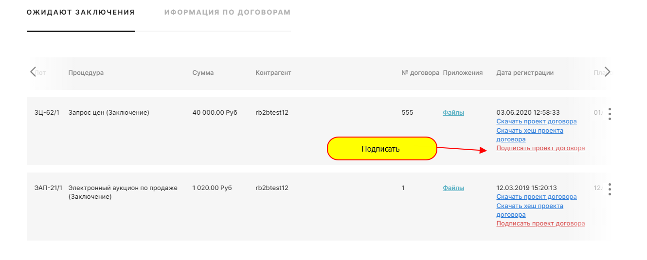 После подписания всех файлов , выполнить подписание проекта договора :